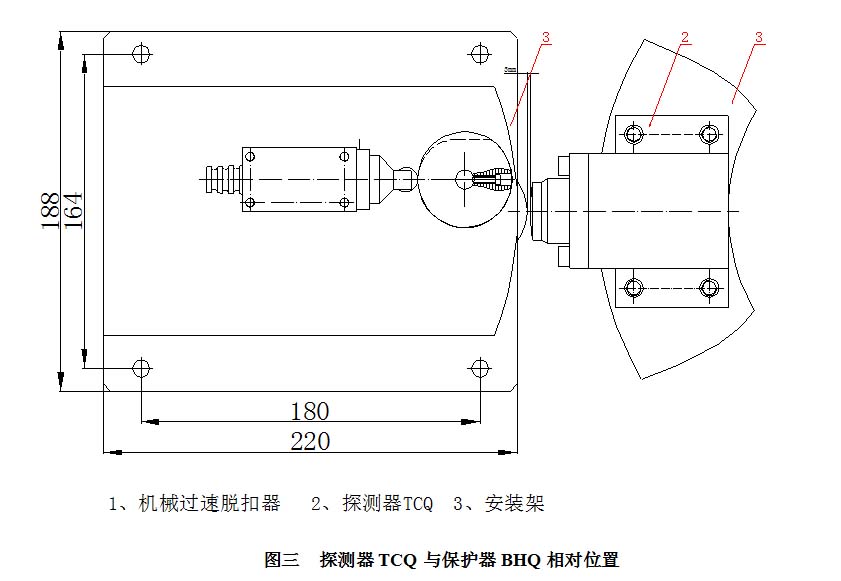 3、安裝過(guò)速保護(hù)器BHQ(由業(yè)主自己根據(jù)現(xiàn)場(chǎng)情況配裝,應(yīng)有足夠的空間供保護(hù)器完成手動(dòng)復(fù)位)及過(guò)速保護(hù)器BHQ的安裝螺栓不能完全緊固,以便于后面調(diào)整,安裝時(shí)要求液壓閥中心高度與過(guò)速探測(cè)器在同一高度,同時(shí)脫扣裝置的一邊與主軸中心線重合(如圖三),然后鎖緊螺栓。
