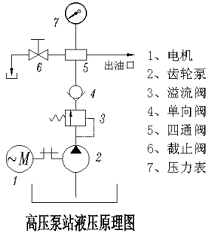 電動機通過聯(lián)軸器直接帶動齒輪泵泵油,壓力油經(jīng)過溢流閥調(diào)節(jié)通往單向閥到達(dá)四通集成塊,分別供給壓力表、調(diào)節(jié)截止閥和用油對象供油;